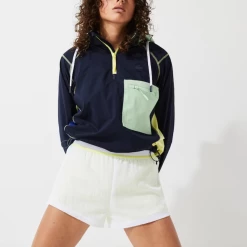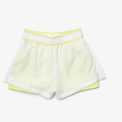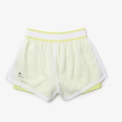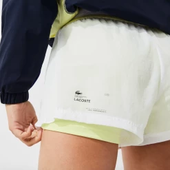 Fashion meets technical crafting in the form of this feminine pair of Lacoste Sport shorts. Crafted in lightweight recycled nylon, they are equipped with built-in compression shorties in a contrasting fabric. A striped elasticised waist and side pleats ensure a great freedom of movement. Truly essential for your next match, with well-designed accents.